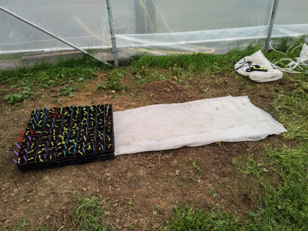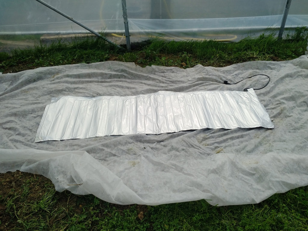 - Ensuite, nous avons positionné une nouvelle nappe chauffante mais de plus grande taille (2 m x 0,70 m). Afin de pouvoir la protéger, nous l’avons entouré d’un peu de voile d’hivernage, ce qui n’est peut-être pas la meilleure idée finalement, car la diffusion de la chaleur est plus limitée :
