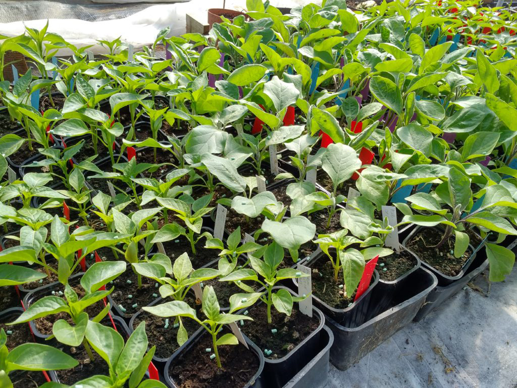 En comparant avec la tomate, la croissance des poivrons/piments/aubergines (PPA pour les intimes) est beaucoup plus lente. Dès le départ, les semis sont plus longs (tomates = 4-5 jours, les PPA = 7-8 jours). L’enracinement est plus long aussi et les plants paraissent végéter jusqu’à l’été, avant de vraiment commencer à produire des jolis fruits qui seront mûrs en milieu d’été pour l’aubergine et plutôt à partir de fin août (voire septembre) pour les poivrons, dans notre climat tempéré angevin.
