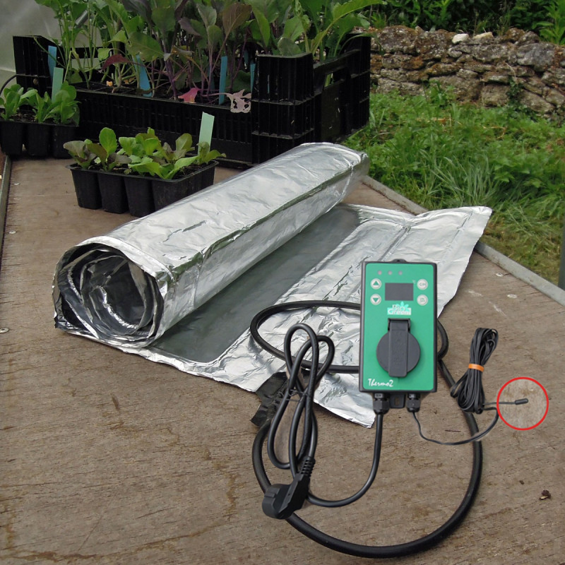 L‘avantage, c’est que vous gérez l’hygrométrie et la chaleur, car la nappe est reliée à un thermostat, lui-même relié au terreau par l’intermédiaire d’une sonde. Vous choisissez la température et, tant que le terreau n’est pas à la bonne température, la nappe chauffante continue à chauffer. Pour une bonne levée des PPA, il vous faut 25 °C, jour et nuit, et cet outil le permet.