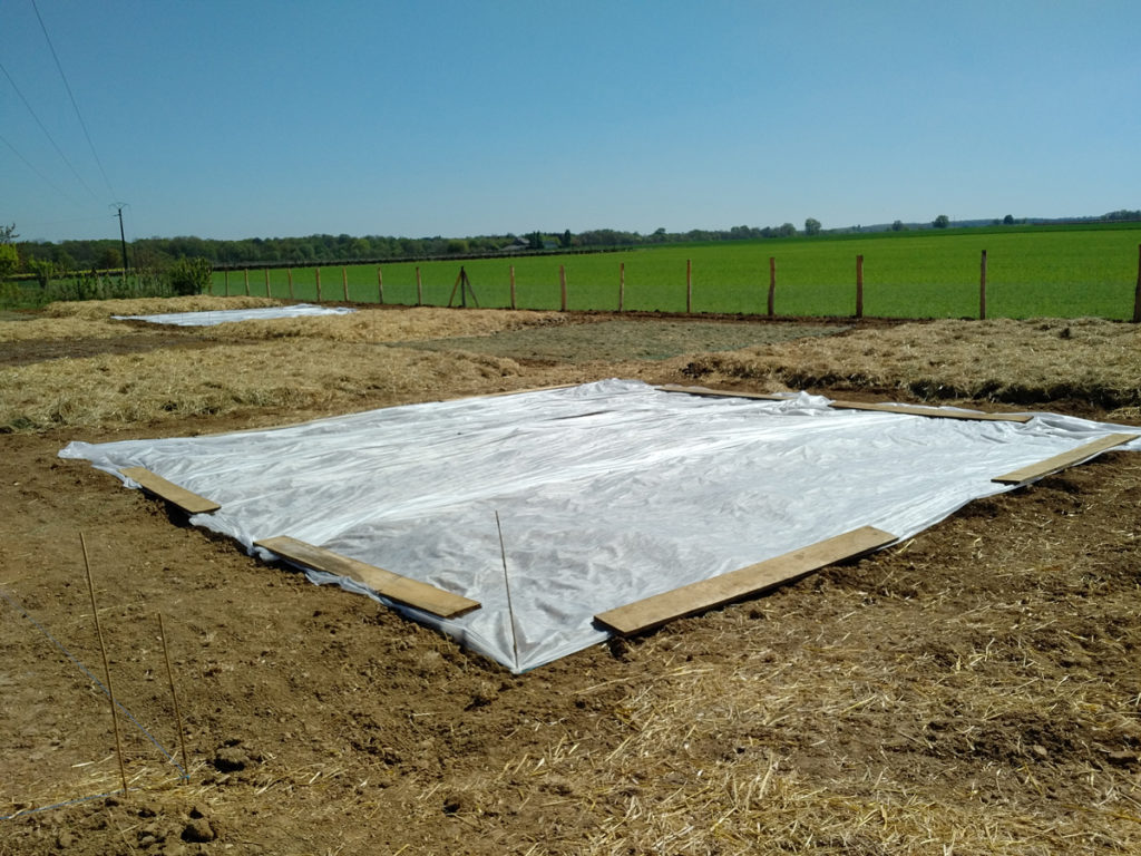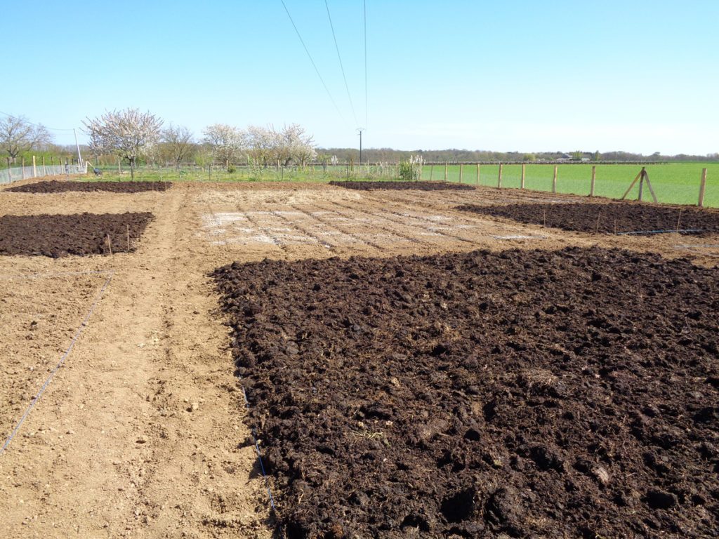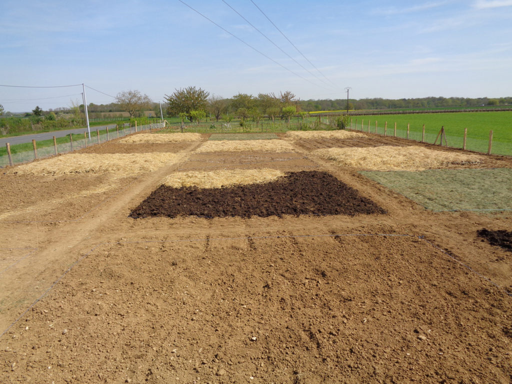 Nous avons pu faire l’acquisition du terrain que tardivement ce qui ne nous a pas permis de réaliser les travaux « d’automne » tel que l’épandage du fumier et son enfouissement. Pour cette raison, et aussi parce que l’on avait envie de redynamiser cette belle terre et d’apporter de l’humus et de la vie, on a décidé de quand même épandre du fumier, uniquement sur les planches recevant, fin mai, les cucurbitacées (courges, courgettes, patissons, melons, pastèques). Nous avons fait le choix de l’épandre en couche épaisse mais sans l’enfouir, puis de le recouvrir de paille. Nous écarterons l’ensemble lors de la plantation des cucurbitacées. Afin de voir si cette action est positive, la planche n°8 située au milieu du potager n’a été que paillée, et nous y planterons des plantes-témoin. N’hésitez pas à nous faire votre commentaire, les avis reçus sont tous tellement différents ! Nous, on teste qu’on vous dit, on teste ! 🙂
