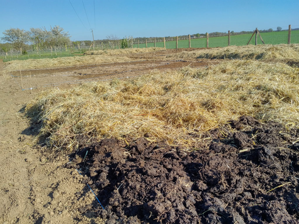 Notre terrain est nu et, s’il ne pleut pas beaucoup en ce début de printemps, il nous est apparu judicieux de protéger les planches avec différents paillages, déjà pour éviter la pousse des mauvaises herbes, mais aussi pour maintenir le peu de fraicheur restant.