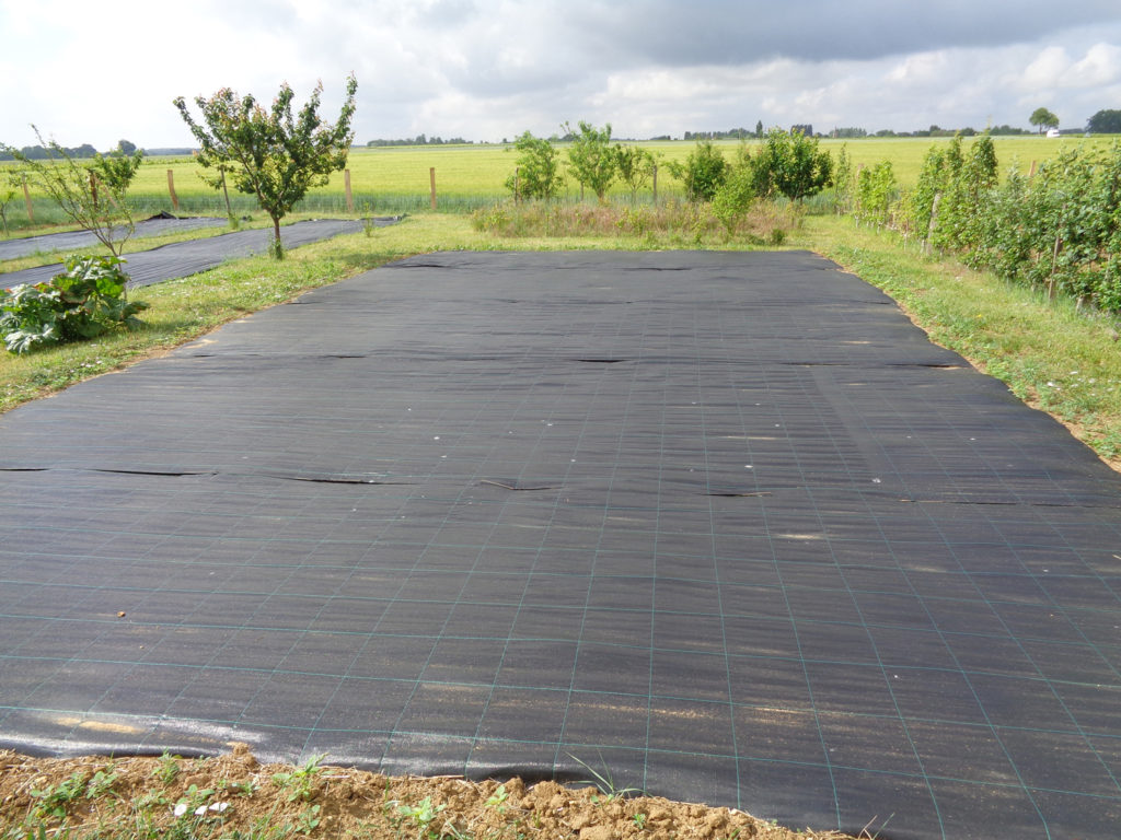 Vers la fin avril, nous avons passé la motobineuse pour aérer le terrain puis recouvert d’une bâche horticole noire, épaisse (110 g/m²) :