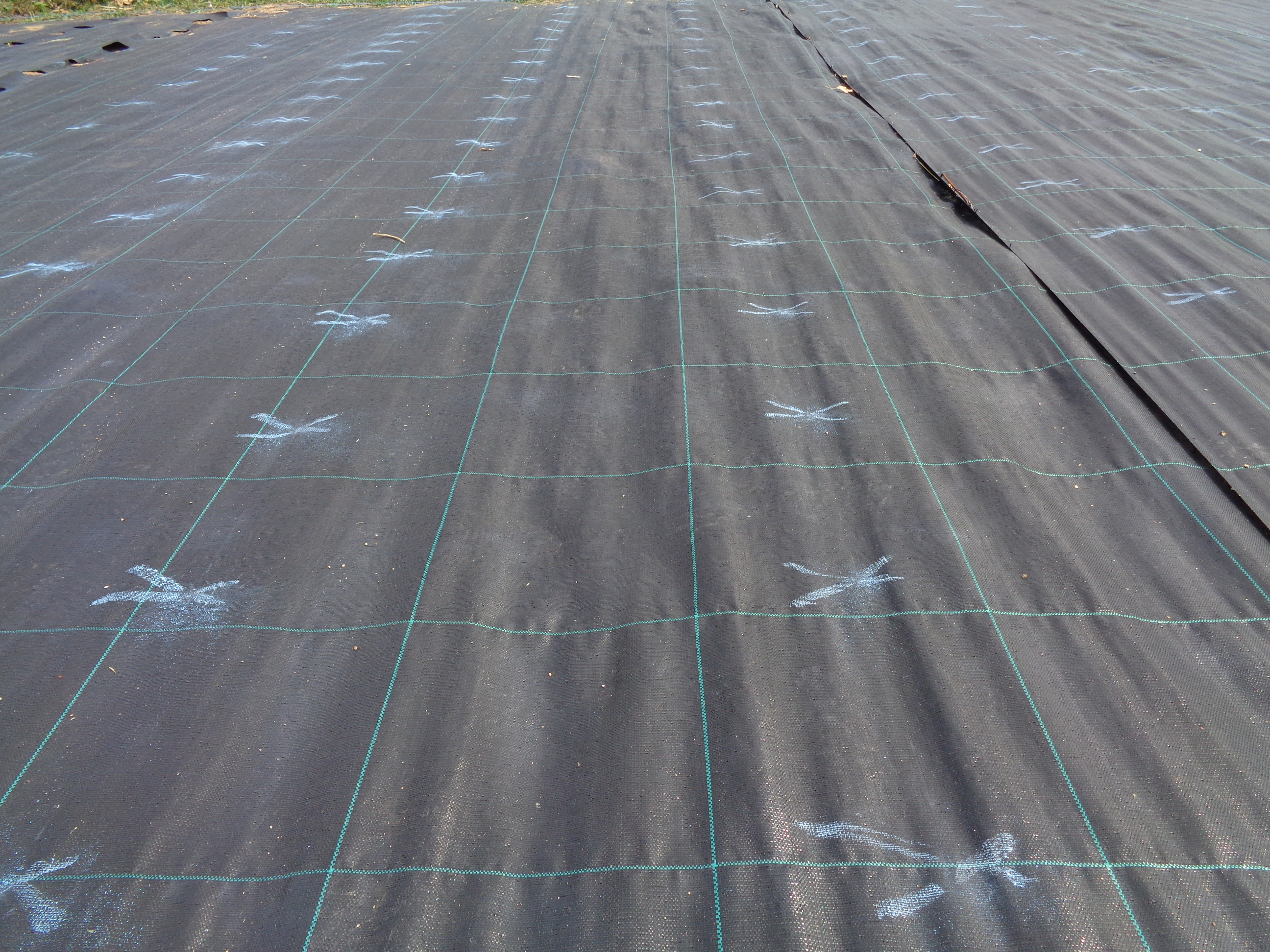 Bon, vous l’avez vu, la bâche était posée, bien tendue et (bien réfléchi !), elle est quadrillée. La simplicité aurait consisté à se servir des repères pour prévoir nos trous mais nous, on aime les challenges, alors on ne l’a pas fait comme ça ! En vérité, les quadrillages sont tous les 24 cm (étrange, non ?) et des rangs tous les 48 cm, ça nous paraissait trop serré. Ce n’est pas comme si on manquait de place, hein ! On est donc parti sur 60 cm, du coup tout était décalé :