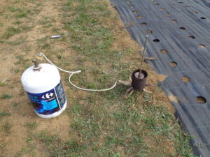 Ce magnifique outil breveté La Bonne Graine permet, une fois chauffé, de percer la bâche. Nous obtenons des cercles égaux en taille et la chaleur cautérise la bâche (cela évite l’effilochement) :