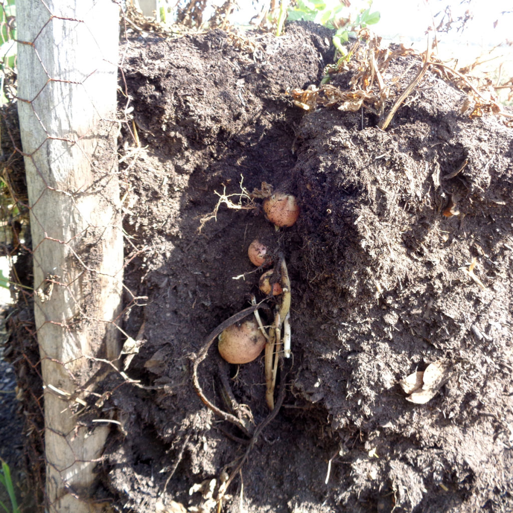Il n’y avait que quelques pommes de terre sur les 20 premiers centimètres de la tour. Il fallait ensuite atteindre le fond de la tour pour apercevoir à nouveau les patates. Sur la hauteur des tiges aucun tubercule ne s’était développé. La récolte à été très faible. Malgré une croissance plus rapide dans le compost la quantité de pommes de terre était plus conséquente dans la tourbe (mais ce n’était pas les mêmes variétés, on ne peut donc pas en tirer de conclusions).