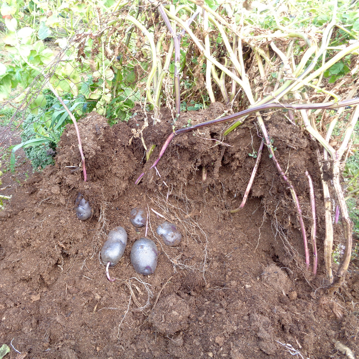 les deux variétés ont eu un développement plutôt réduit en feuilles ( mais sur hautes tiges ) , mais de beaux tubercules. Impossible d’arroser pendant les mois brûlants car l’humidité de la paille ( du foin sèché plus exactement) attire toutes les limaces et escargots du coin !!!! , ramassées à la main en abondance tous les jours sur les plants les plus près de ma haie !!!! pas dangereux pour les tubercules mais pour les tiges et feuilles si !!!