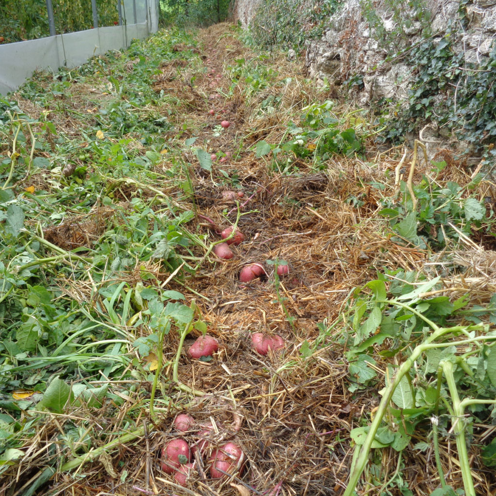 C’est bcp plus rapide et moins fatigant à faire que les grosse buttes, le démarrage est presque immédiat (si plant bien prégermé) et là les racines seront en terre mais bcp de PdT seront dans la paille (épaisse pour éviter tout verdissement.