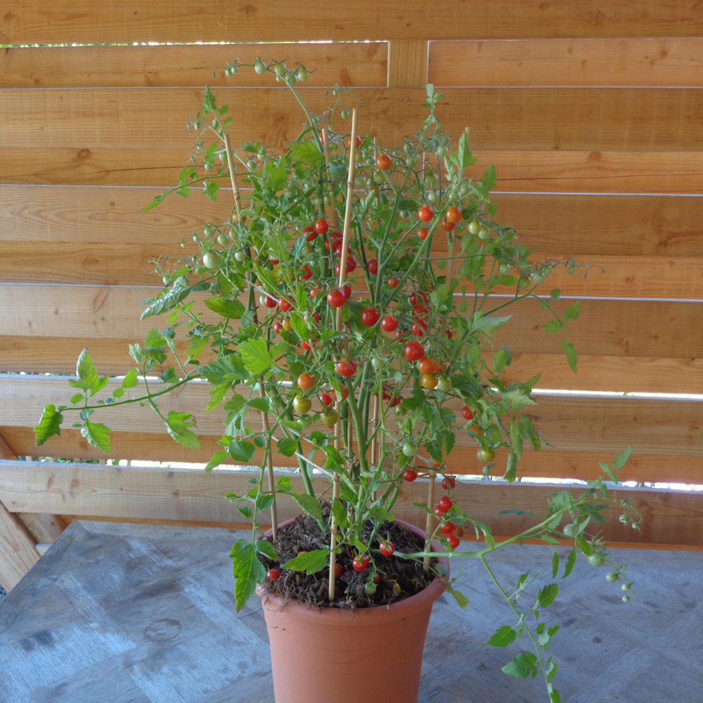 Ensuite, les variétés pouvant convenir ne sont pas si nombreuses. Si, en théorie, toutes les tomates cerises pourraient faire l’affaire, nous ne pouvons vous le conseillez. En effet, une tomate cerise basique est à port indéterminé, c’est à dire qu’elle pousse tant qu’elle rencontre des conditions favorables. En fin d’été, les besoins de tuteurage seront tels que vous serez clairement dépassé ! Pour éviter ce problème, les variétés sélectionnées étaient naines ou à port déterminé.