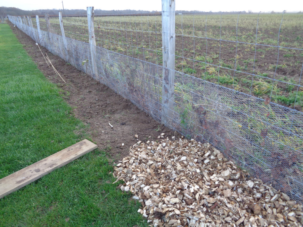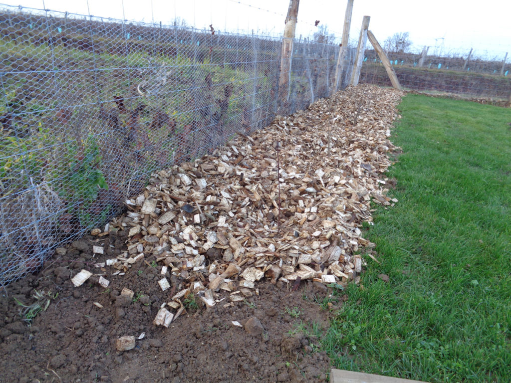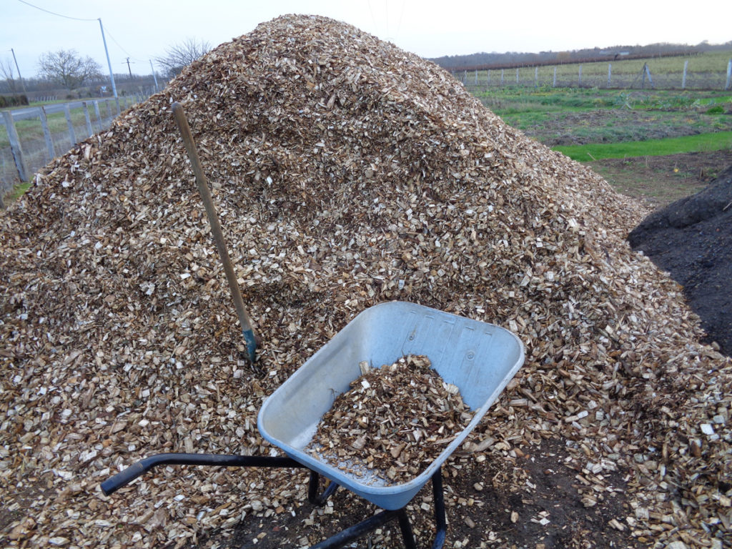 Enfin, nous n’avions plus qu’à mettre du paillage. Sur environ 30 cm d’épaisseur et 80 à 90 cm de largeur, il a été déposé un paillage de coeur de peuplier.