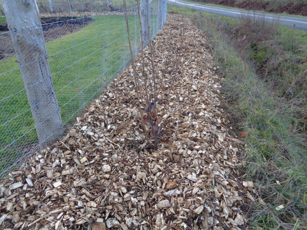 Le paillage assurera un rôle de protection contre les mauvaises herbes. Il garantira aussi une fraîcheur au pied des arbustes tout en faisant des économies d’eau. De taille grossière et au pH neutre, il se décomposera lentement et restera en place plusieurs années tout en favorisant la biodiversité au sol. Au bout de 4 à 5 ans, il sera totalement désagrégé et permettra à la haie, bien installer, de drageonner et de se densifier.