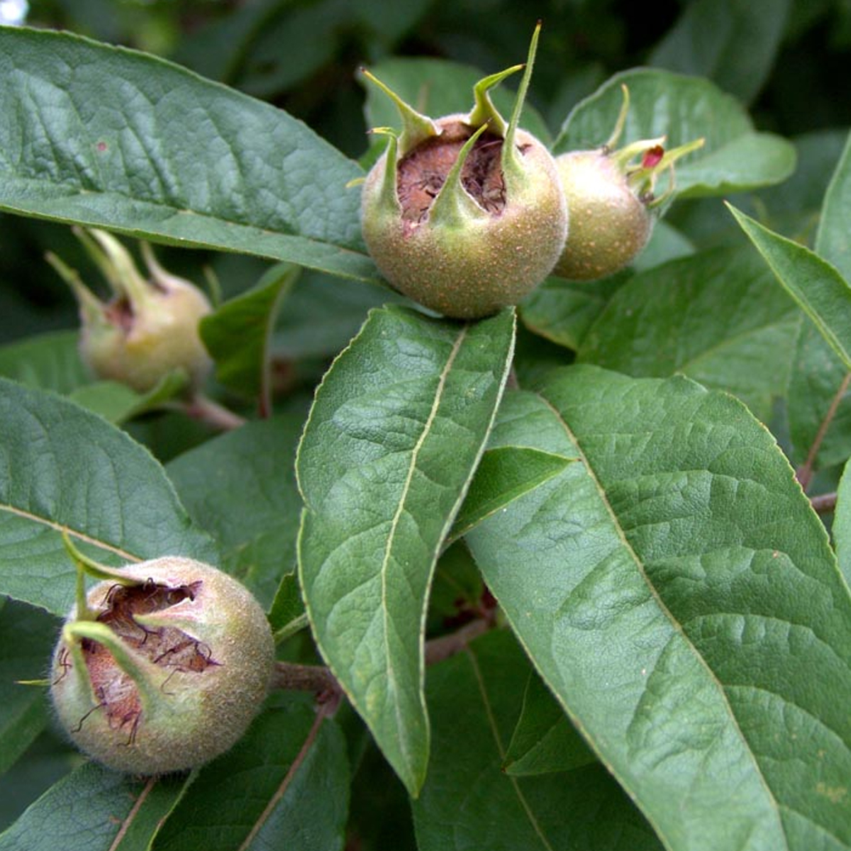 -Le Néflier (Mespilus germanica) petit arbre à port assez étalé, de 5 à 6 m de haut, à tronc et rameaux tortueux et présentant une écorce écailleuse. Ses fruits se récoltent tardivement, fin octobre (après les premières gelées).