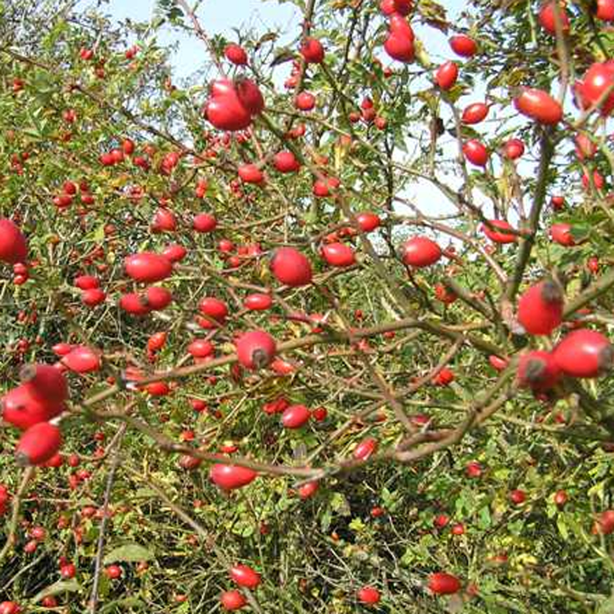 -L’Eglantier (Rosa canina), essence très présente dans les haies de nos régions. C’est une espèce de rosier botanique à fleurs simples. Ses fruits (cynorhodons) peuvent provoquer de légères démangeaisons à cause des poils qui se trouvent à l’intérieur. D’ou le terme de «gratte-cul» souvent utilisé dans les cours d’écoles. 😉