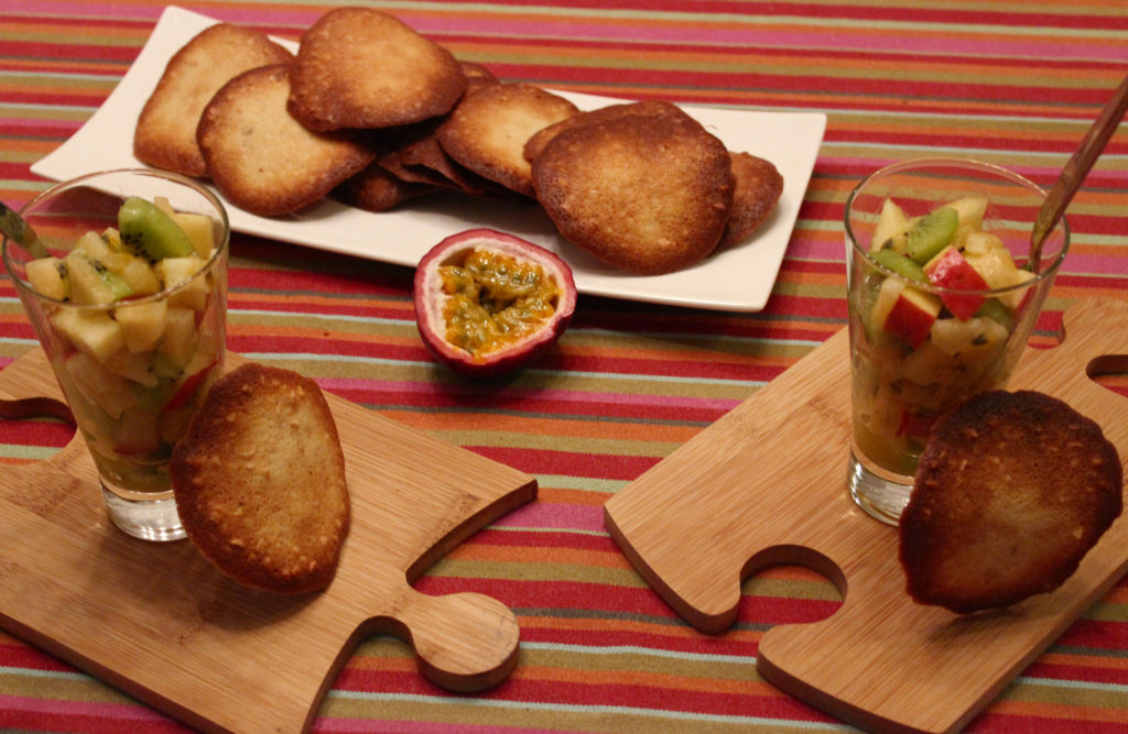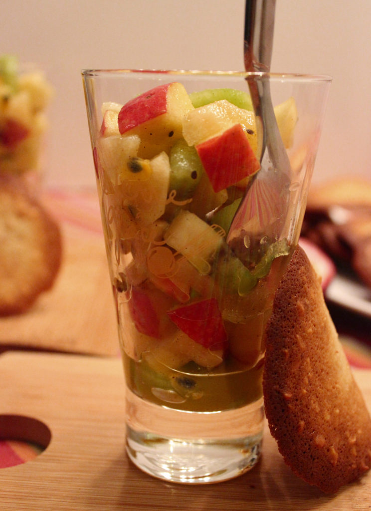 Par Séverine, du blog cuisine de La petite cuisine des chafouineries : « Une salade de fruits délicieusement acidulée. Dans cette recette, pommes et poires de terre apportent du sucre naturel, mais on pourra apporter un peu plus de gourmandise en ajoutant (au dernier moment pour éviter de cuire les fruits) un peu de sucre de canne ou de sucre de fleur de coco (édulcorant naturel issu de la sève des fleurs de cocotiers) pour apporter une note caramélisée sans culpabilité !«