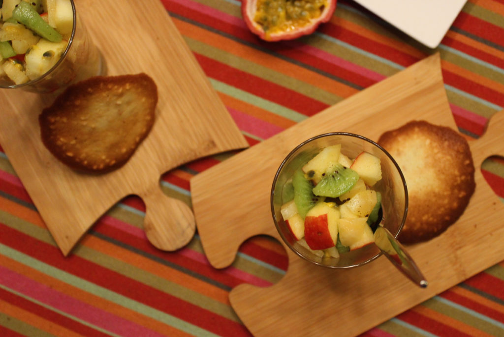 Cette petite salade de fruits s’accordera à merveille avec une chantilly bien vanillée, une boule de glace ou de sorbet à la mangue, des tuiles aux amandes ou autres biscuits !