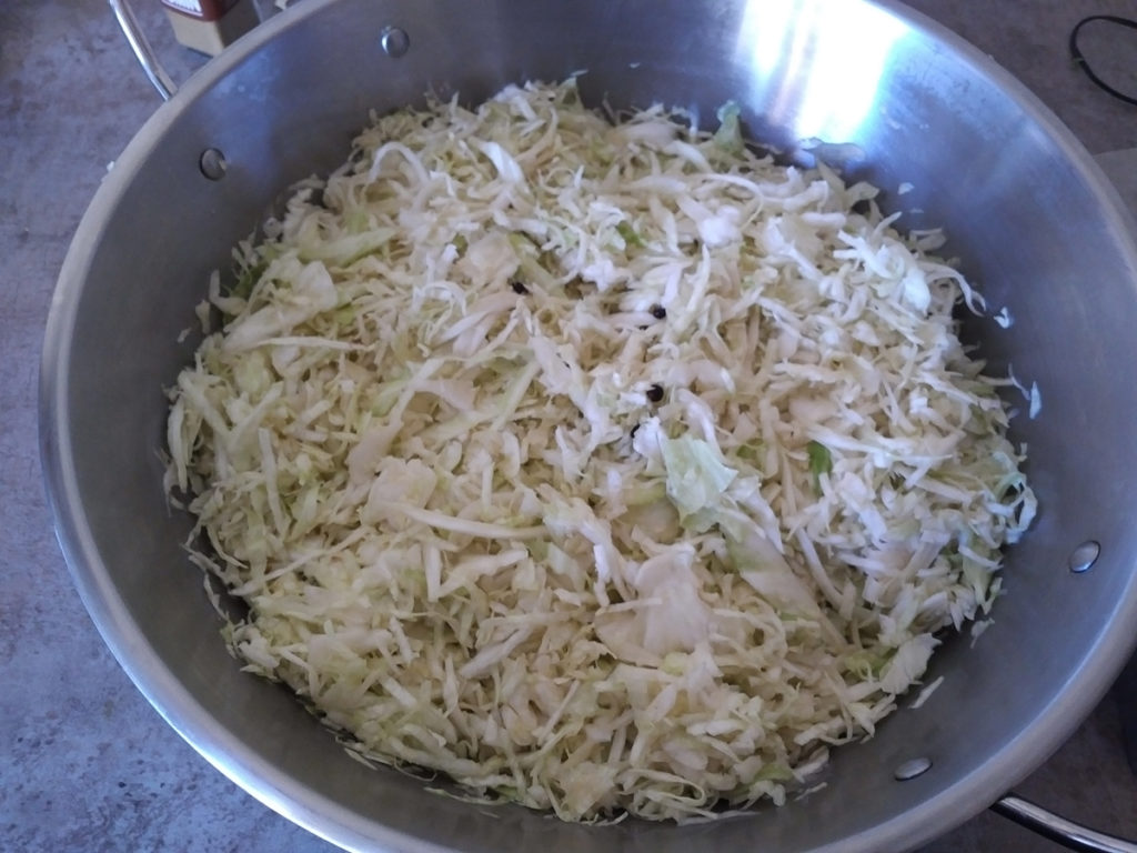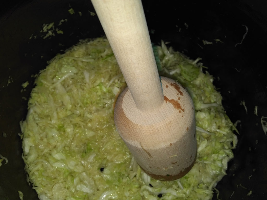 -une fois émincé, il vous faudra peser le chou afin de connaitre la proportion de sel à apporter (1% soit 10 grammes par kilo de chou). Mélangez bien le sel et les épices, laisser reposer un bon quart d’heure, puis re-mélangez mais cette fois-ci vigoureusement, en le pressant fort avec vos mains (bien propres, évidemment ! 😀 ) pour faire sortir le jus du légume.