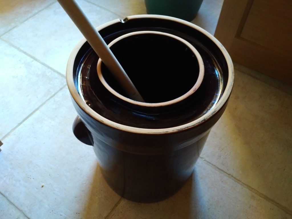 Le pot en grès possède une rigole que l’on remplit d’eau. Une fois le pot refermé, l’eau fait office de joint, laissant s’échapper les gaz de l’intérieur vers l’extérieur mais ne permettant le chemin inverse. Au début de la fermentation, vous entendrez à intervalles réguliers les bulles d’air qui éclatent, ça surprend la première fois !