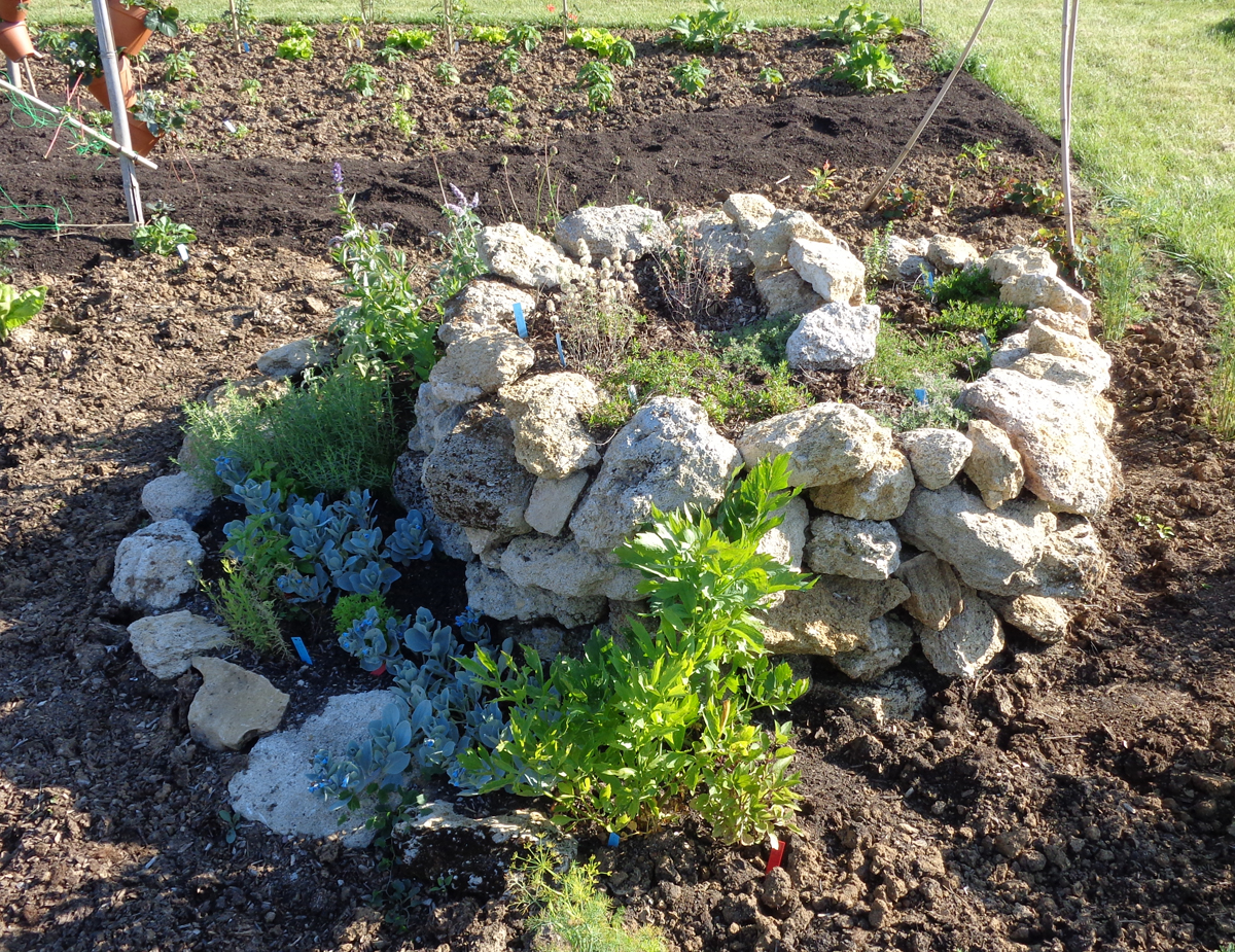 Vous pourrez y planter différentes variétés d’aromatiques, et n’hésitez pas à ajouter des vivaces et plantes de rocailles qui apporteront de la couleur à leur tour et aussi de nombreux insectes !