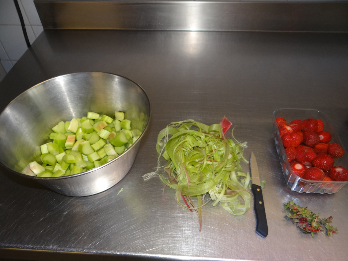 Laver et équeutter les fraises, puis éplucher la rhubarbe et la couper en morceaux :