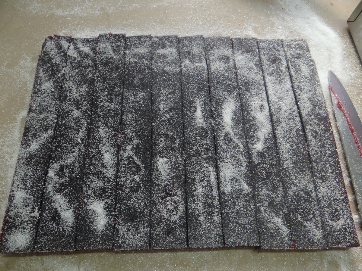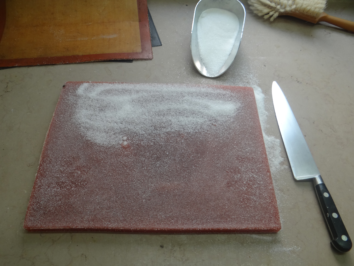 Une fois prise, sucrer la partie supérieure et inférieure de la pâte de fruits, puis couper les morceaux de la grosseur souhaitée. Une fois coupés, tremper les morceaux dans du sucre (cristalisé de préférence) pour les faire croûter et pour garder le moëlleux. Laissez-les une journée à l’air libre puis les conserver dans une boîte hermétique :