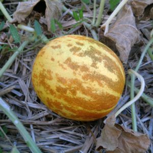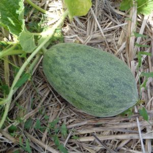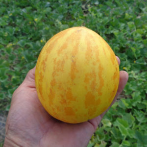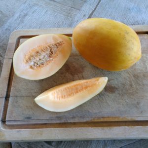 Un melon allongé comme un ballon de rugby, avec une peau d’un beau orange à maturité et une chair plus pâle, rose saumon. Un bon goût de melon, pour le coup, mais peu sucré, avec une chair fondante et la forme d’une pastèque. Fruit entre 700 et 900 grammes.