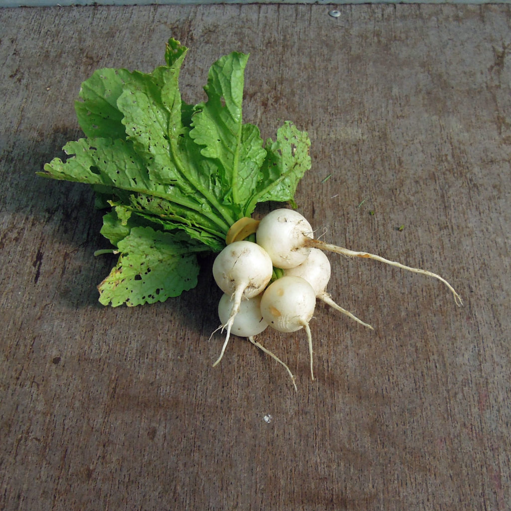 Rond National : le radis à bout blanc classique… mais rond. La levée a été irrégulière en s’étalant sur deux ou trois jours. Les feuilles sont petites, les racines également, ces dernières sont d’une saveur légèrement relevée, la variété semble être plus tardive que les autres testées. Un standard un peu dépassé.