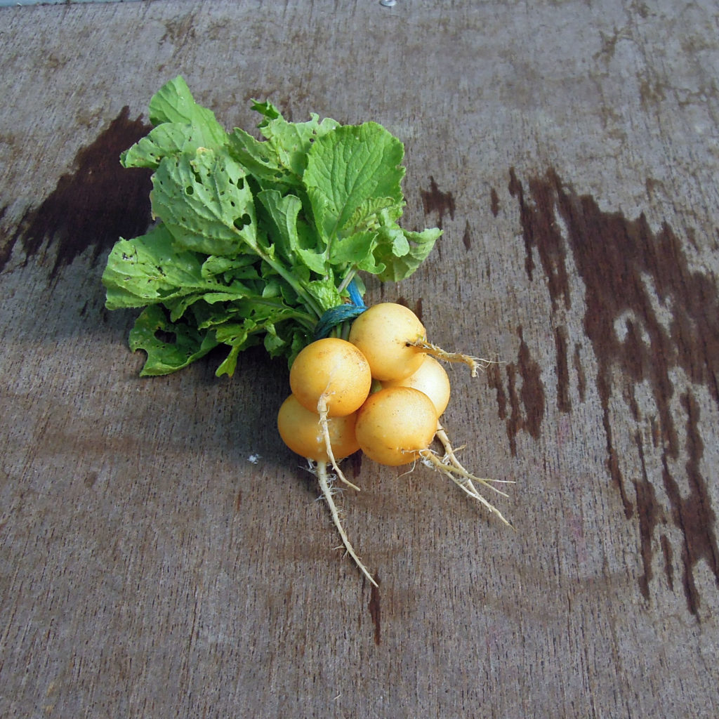 Horus : deuxième variété jaune du test, son feuillage est peu développé et sa racine est plus clair que la variété Zlata. Le radis est également plus petit en moyenne mais très homogène ce qui tend vers une récolte groupée, un peu plus tardif également. La saveur est douce et très peu ont piqué. Une variété intéressante pour le maraîcher professionnel qui récoltera en une ou deux fois mais trop proche de Zlata pour être intégré à notre gamme.
