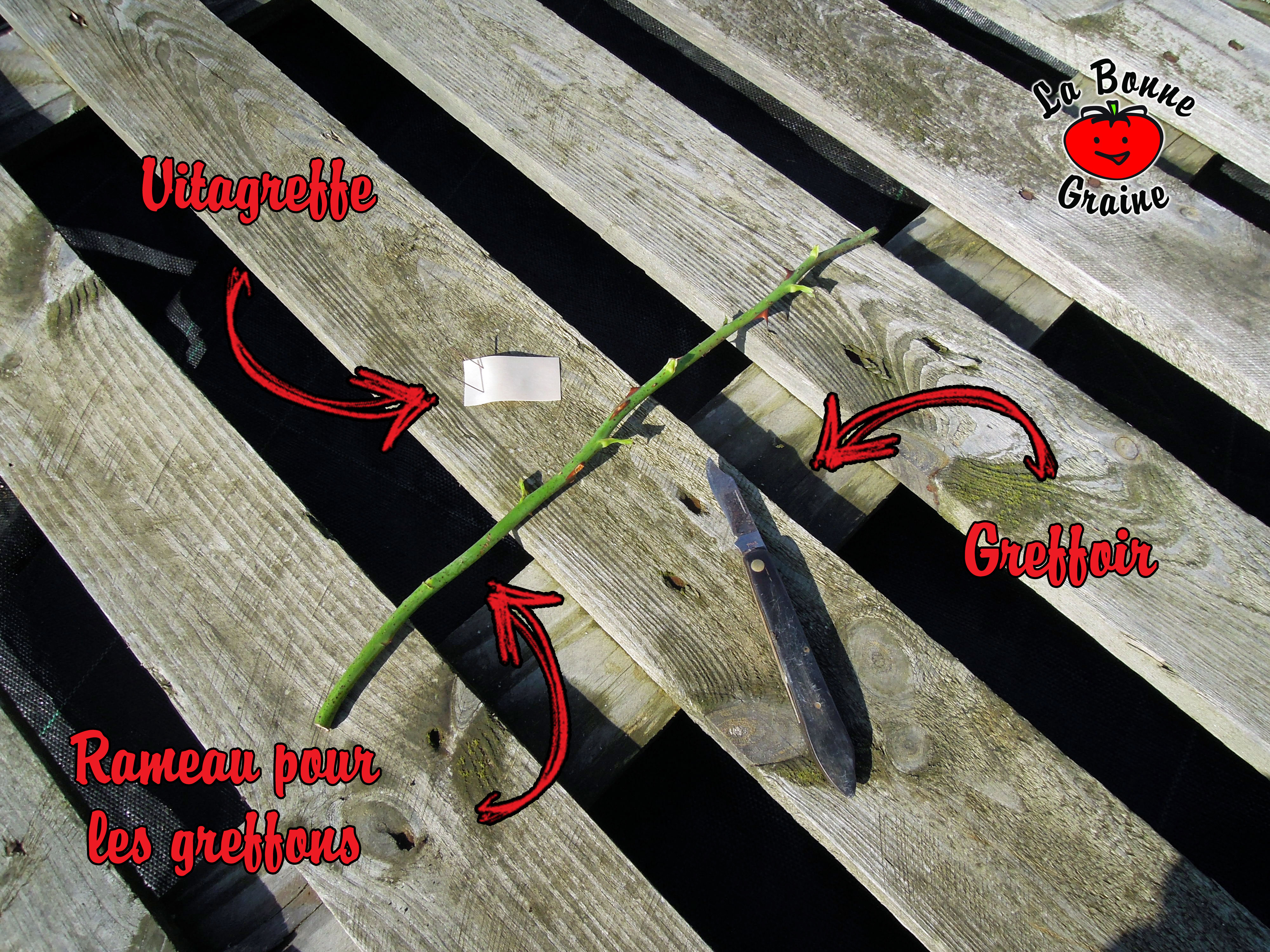 greffage-rosier-matérielPublié par Le Jardin d'Essai le 27 décembre 201927 décembre 2019Le greffoir sert à entailler, le rameau est le rosier à multiplier et la vitagreffe à pour rôle de pansement.