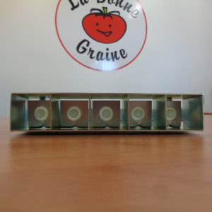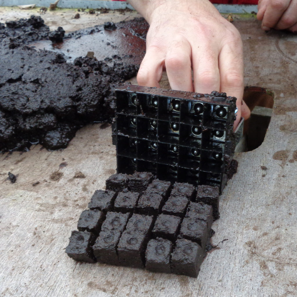 Avec cet outil, on part sur la création de 5 mottes de 38 mm de côté à chaque usage. Cette taille intermédiaire est intéressante pour tous ceux qui ne souhaitent pas repiquer par la suite : la motte est assez grande pour la plupart des semis, le plant sera suffisamment fort et raciné à la transplantation et, en attendant, la motte ne prendra pas trop de place.
