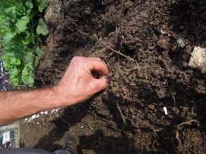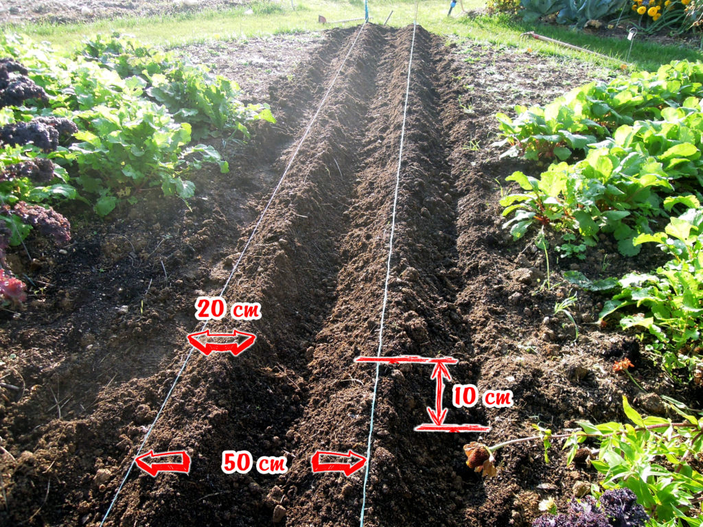 On plantera la pointe du caïeu vers le haut, sur le haut de votre butte, en les espaçant de 15 cm sur le rang et en créant un rang tous les 50 cm environ.
