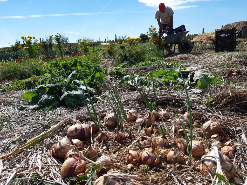 Courant septembre, l’heure de la récolte a sonné, notre jardinier s’est retroussé les manches et s’est mis au travail.  Son petit conseil ?, ramassez les oignons seulement lorsque les tiges auront jaunies et se seront couchées. A ce moment, sortez les oignons de terre et laissez-les quelques jours au soleil, la conservation n’en sera que meilleure.