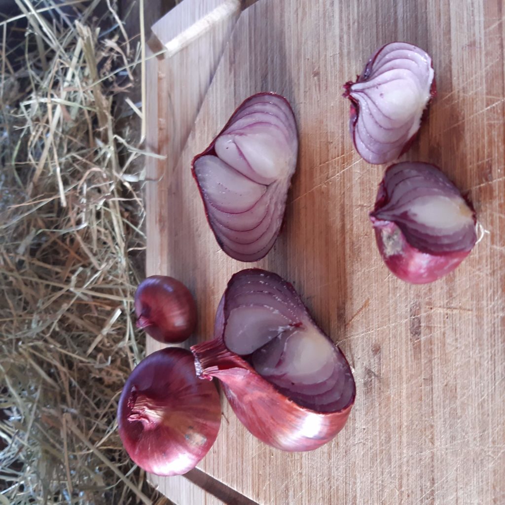 Avec leurs bulbes tous aplatis,  nous nous devons de les inspecter et de les trier afin de leur attribuer des différences. Ainsi, le gagnant de la catégorie le plus aplati sera le Rouge de Genève, effectivement plus écrasé que les autres et au cœur souvent double, très joli à la découpe. C’est une variété mi-hâtive que nous avons ainsi décidé de mettre à la gamme.