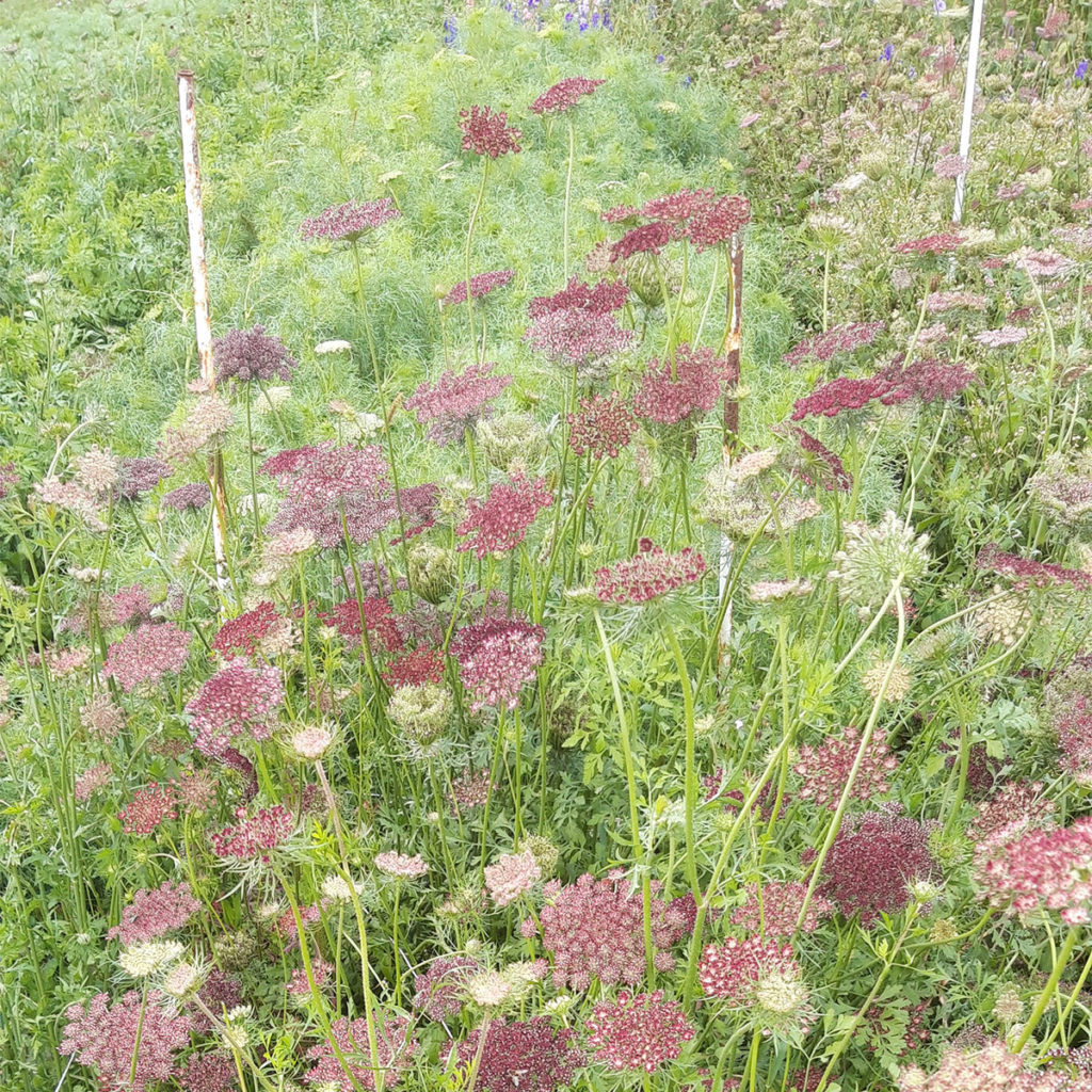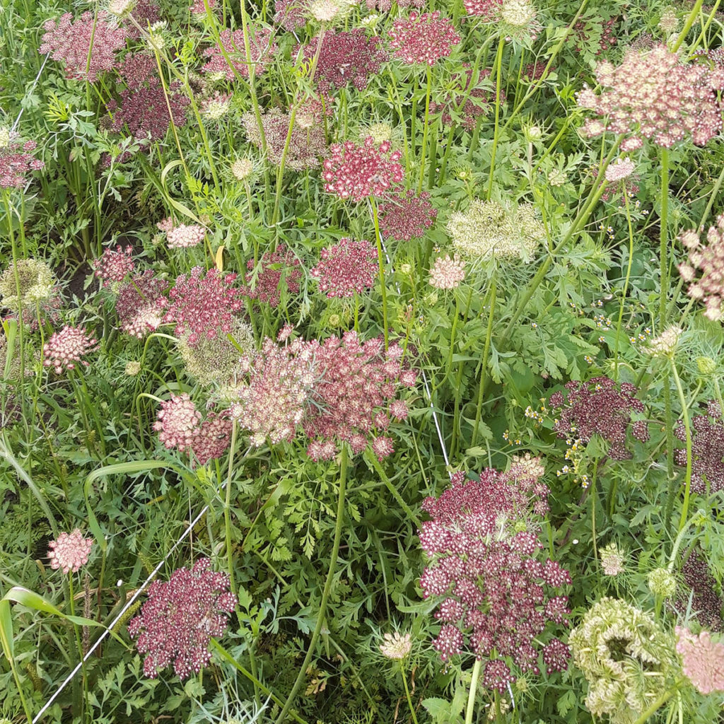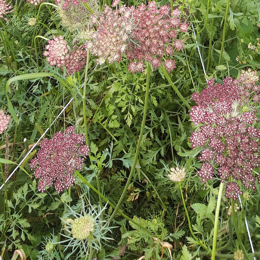 Cette plante décorative n’a rien en commun avec notre bien connu légume-racine, celui que l’on mange et qui fait les fesses roses (du moins à ce que l’on dit ! ?) : la carotte. Pourtant, elle est issue de la même famille, celle des Apiacées (Ombellifères). Son nom générique « Daucus » signifie en latin doux et jus sucré. Cette plante herbacée ressemble au Torilis des champs, cette plante champêtre que l’on retrouve sur les bords des chemins de campagne.