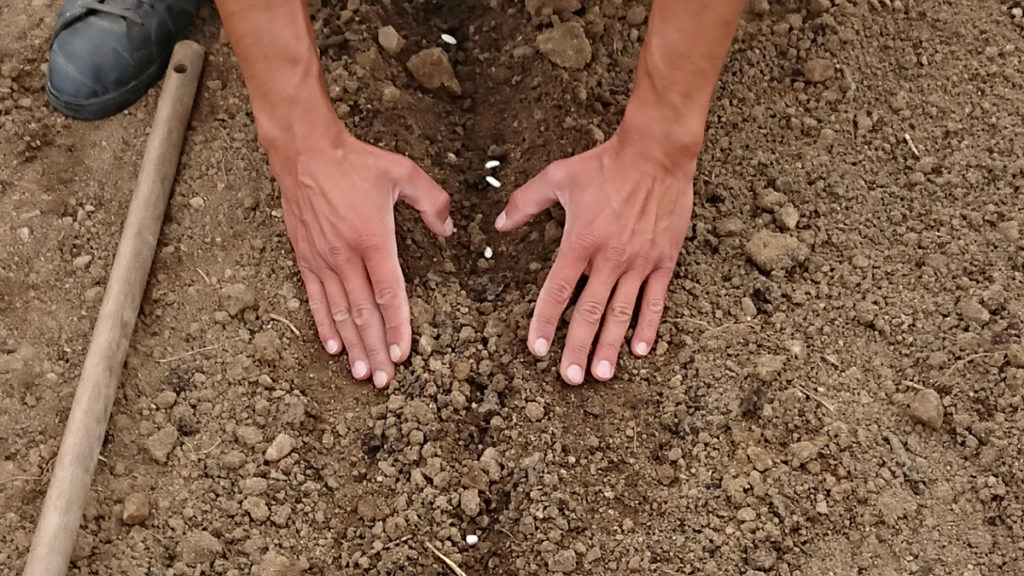 Vous avez le choix entre une culture en ligne (1 graine tous les 5-6 cm dans un trou peu profond – distante de 50 cm) ou en poquets (disposition en quinconce de 4-5 graines dans un trou peu profond tous les 40 cm). Il est conseillé de faire tremper les graines dans de l’eau (de pluie de préférence) entre 1 nuit et 24 heures et/ou d’arroser le fond du rayon ou du poquet avant le semis.