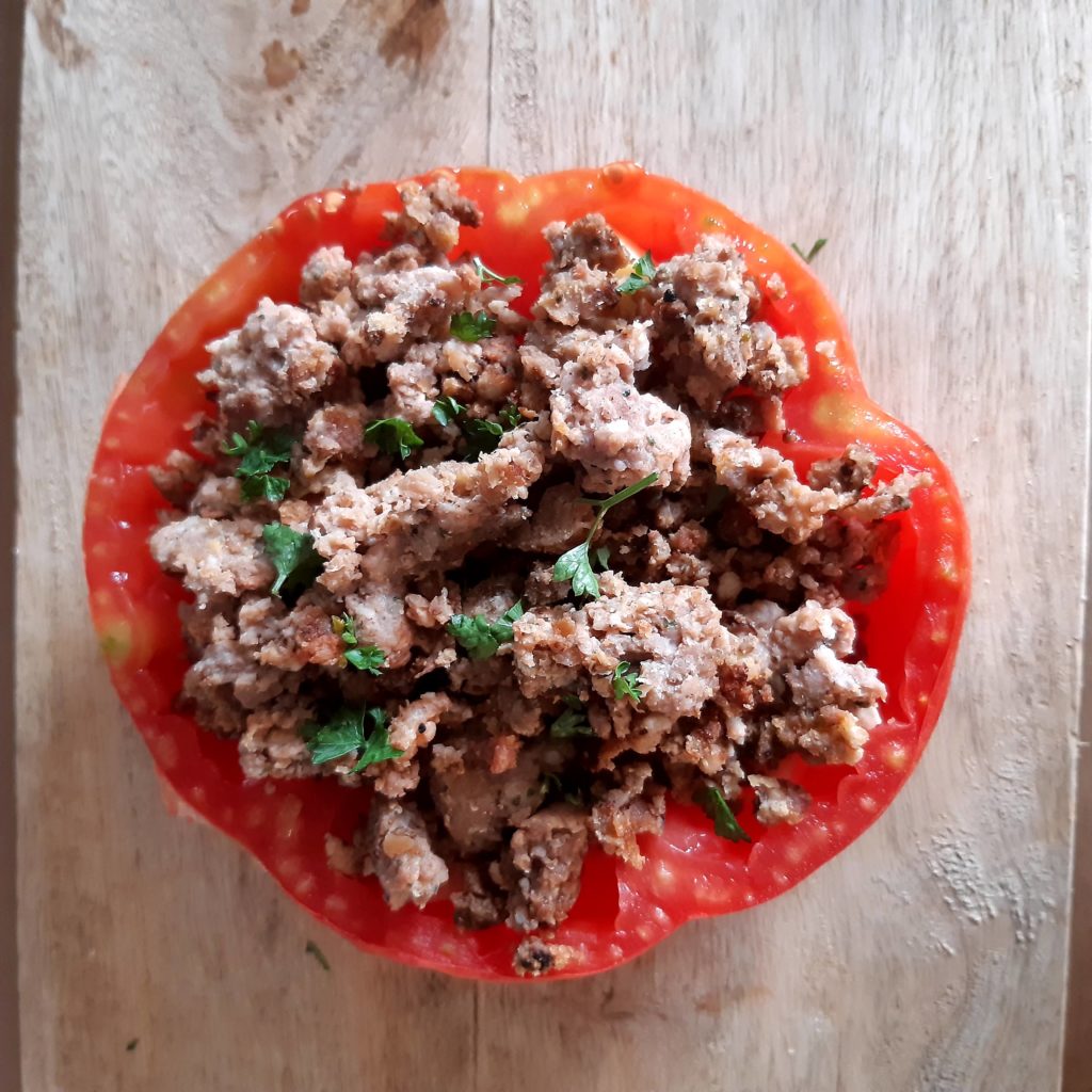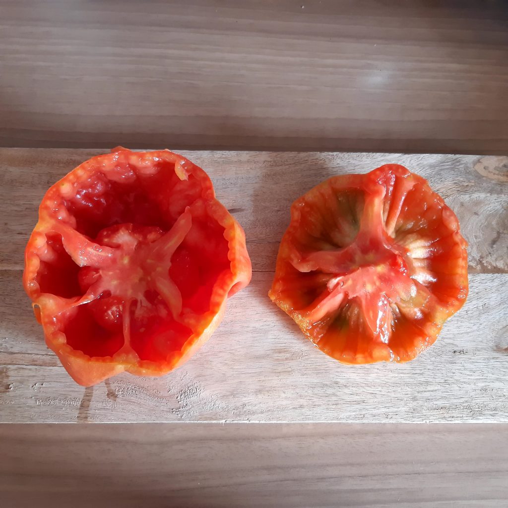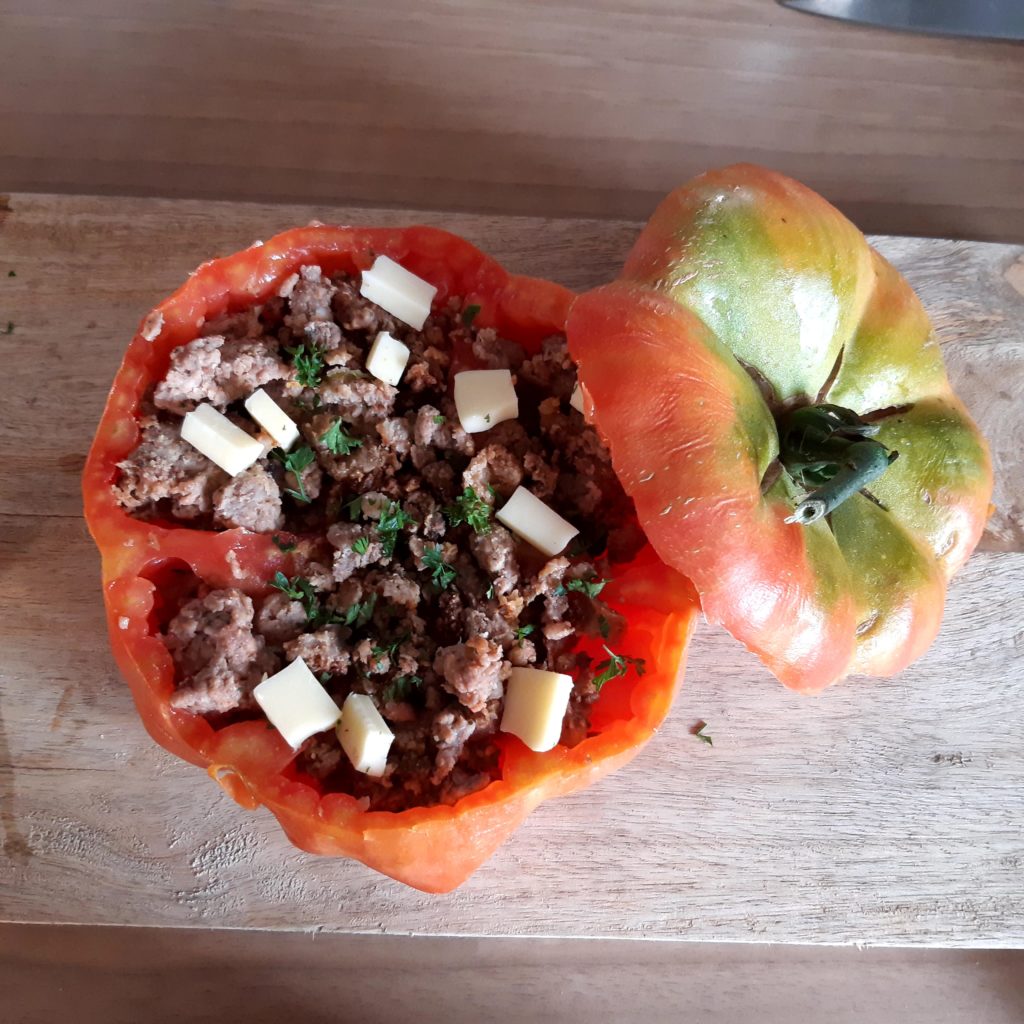 Cette variété de tomate que nous avions en test au Jardin d’Essai, s’est montrée à la hauteur de nos attentes. Elle est grande et surtout complètement creuse, idéale pour ce type de recette. Elle reste ferme et ne s’effondre pas une fois cuite. Elle est tout simplement parfaite pour cet usage !