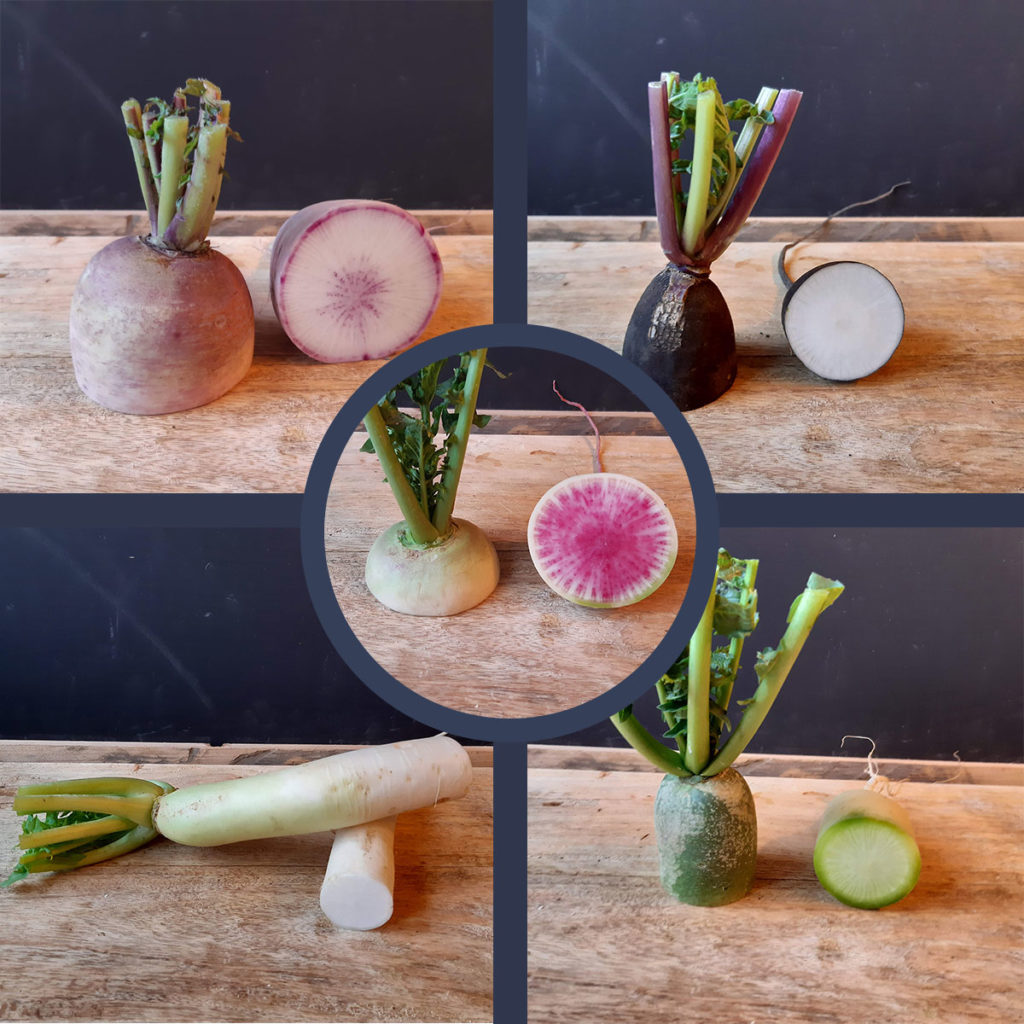 De toute forme et couleur, vous disposez d’une véritable palette variétale concernant les radis asiatiques. Ce sont de gros radis d’hiver, proche du radis noir, mais dont la particularité sont d’être croquant et de saveur douce, moins piquant que les petits radis de tous les mois. A semer à la fin de l’été, vous pourrez en bénéficier tout l’automne jusqu’en décembre.
