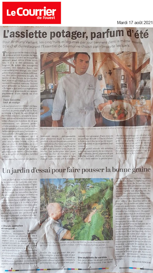 Un double article qui fait découvrir également le Restaurant l’Essentiel à Saumur, où Anthony Vaillant, chef du restaurant a concocté cette saison, une assiette « Potager », avec les produits parvenant directement du Jardin d’Essai. Soyez certains que les légumes sont frais et de saison !