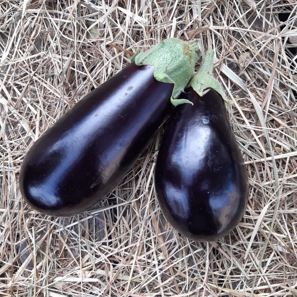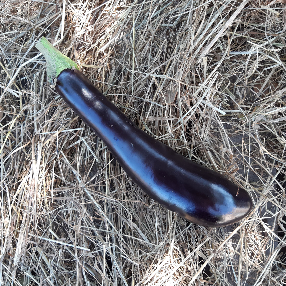 Il faut généralement compter minimum 5 mois pour avoir des aubergines. Ce qui fut le cas pour cette belle aubergine à la peau brillante et assez foncée.