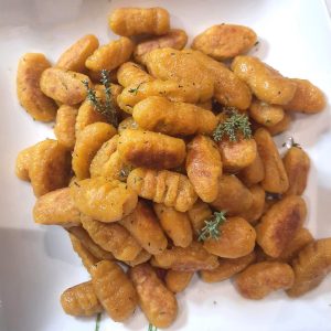 À la maison, nous avons récolté une douzaine de petites courges Butterbush que nous avons cuisiné tout l’hiver : c’est l’avant-dernière qui s’est transformée en délicieux gnocchis ! Vous pouvez utiliser des courges butternut, ou encore les délicieuses Sucrines du Berry.