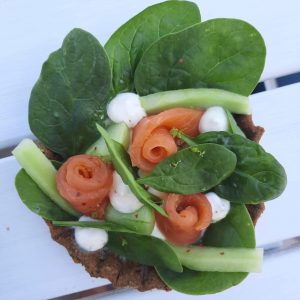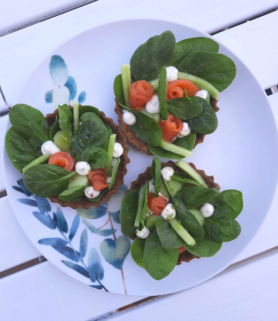 L’idée de ces tartelettes (au-delà de vouloir vous réconcilier avec les épinards !) est de pouvoir servir une entrée originale et rafraîchissante, garnie de crudités : selon vos goûts et les légumes à votre disposition, vous pouvez ajouter des spirales de carottes, des quartiers de tomates cerises, des rondelles de radis, etc… Vous pouvez remplacer le saumon par de la chiffonnade de jambon et quelques billes de mozzarella.