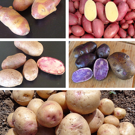 La Désirée, reconnaissable à sa peau rouge, provient des Pays-Bas (1962). La Bernadette, appréciée pour sa chair ferme, est allemande (2002) et la vieille Up to date britannique (1894).