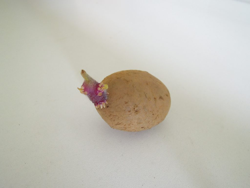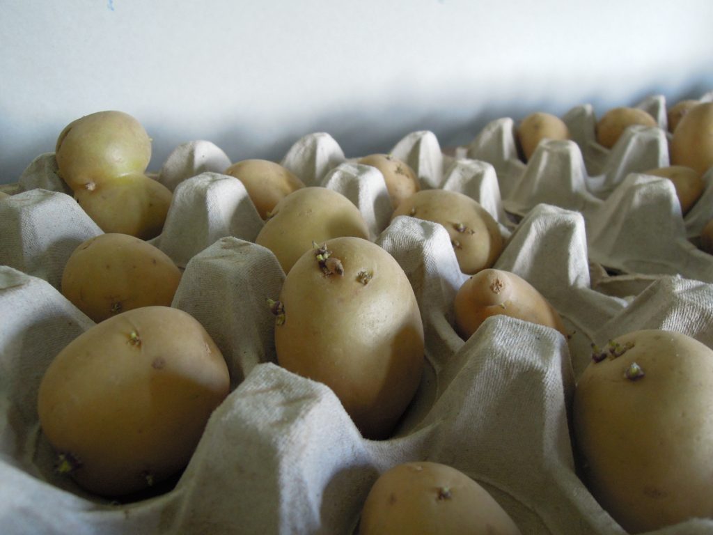Lorsque les germes atteindront environ 2-3 cm, ils s’arrêteront naturellement et attendront d’être mis en terre pour repartir. Vous constaterez que la lumière permet d’obtenir des germes forts, trapus et épais, d’un vert (ou pourpre selon les variétés) soutenu, et non les longs filaments blancs que l’on trouve sur nos patates de conservation, oubliées dans un placard. Cette étape nécessitera entre 4 à 5 semaines.