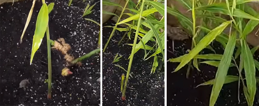 En place, le gingembre développe, comme un roseau, des tiges fines d’1,50 à 2 mètres de haut qui supportent de longues feuilles engainantes et lancéolées d’une quinzaine de centimètres