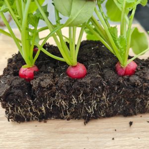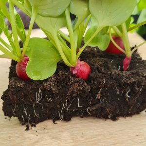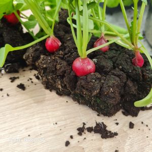 Nous nous sommes lancés le pari d’essayer plusieurs variétés de radis ronds et demi-longs dans nos fameuses mini-mottes. La question était de savoir si la racine allait se développer correctement dans un petit carré de terre compressée ou bien filer et ne rien donner.