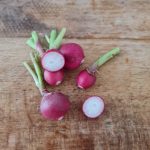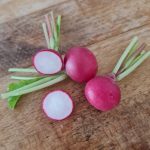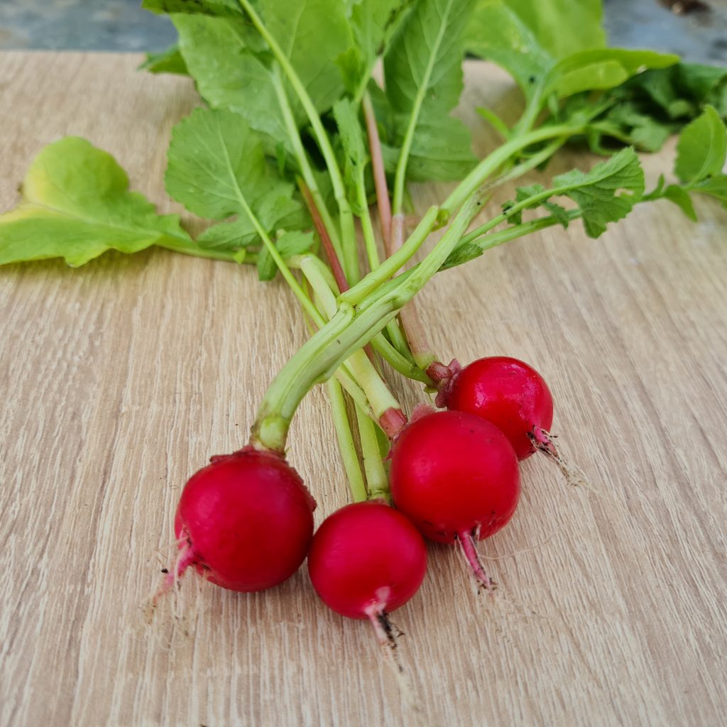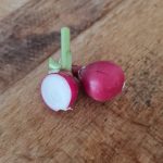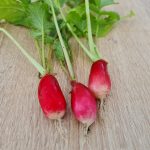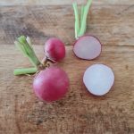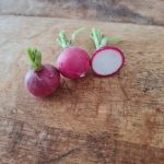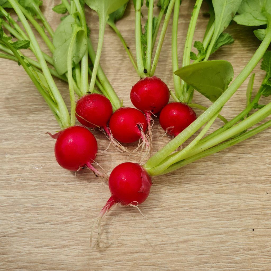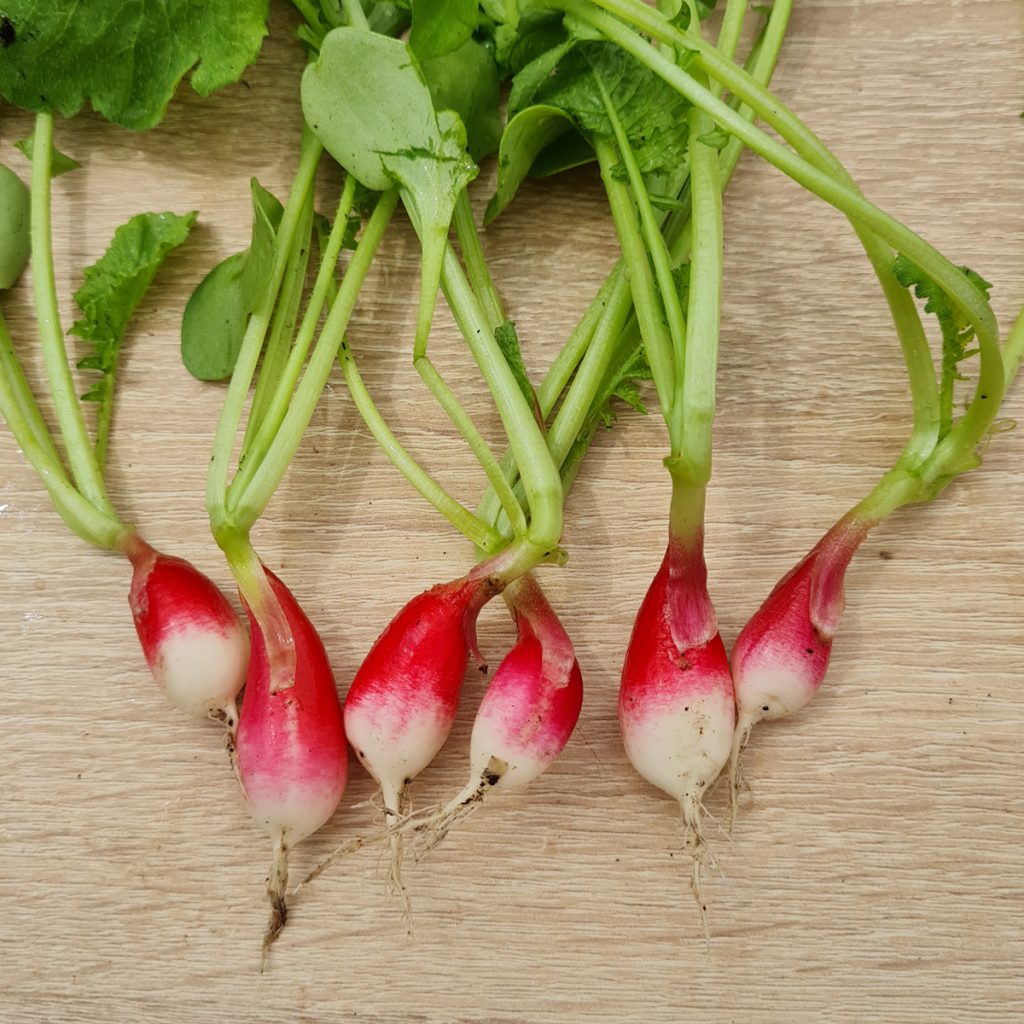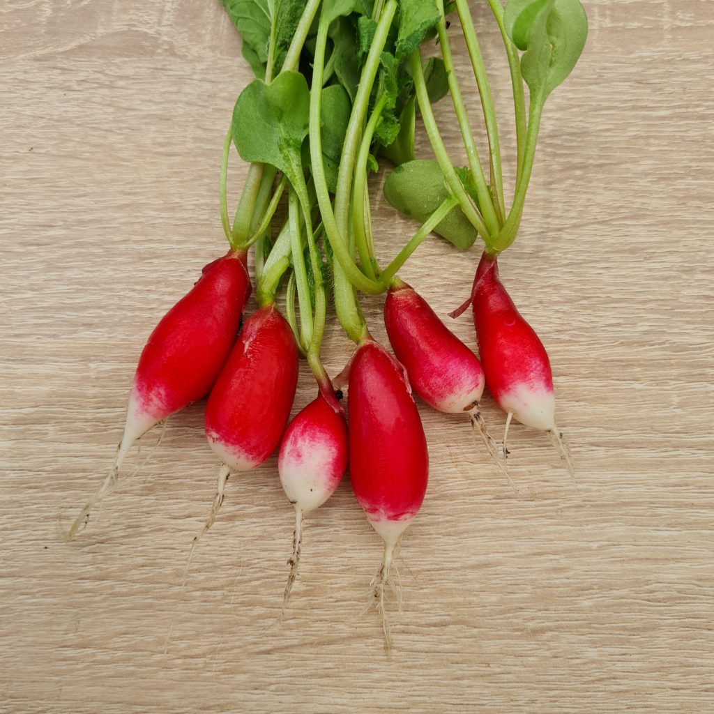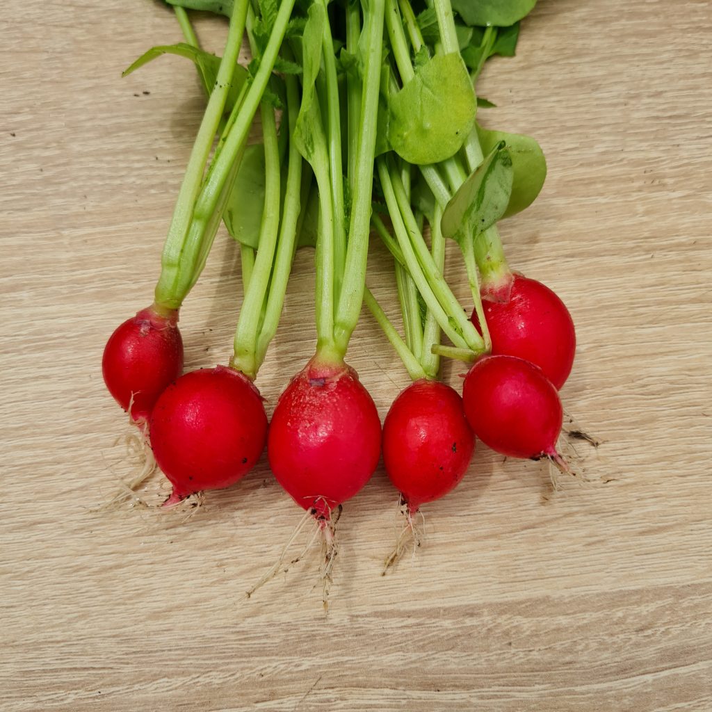 Raxe bio : un radis homogène, rond un peu en forme de toupie. Il a l’avantage de grossir uniformément, tous en même temps, ce qui permet une bonne récolte en une fois. Il est croquant et juteux. Il s’est avéré un peu piquant au second test.