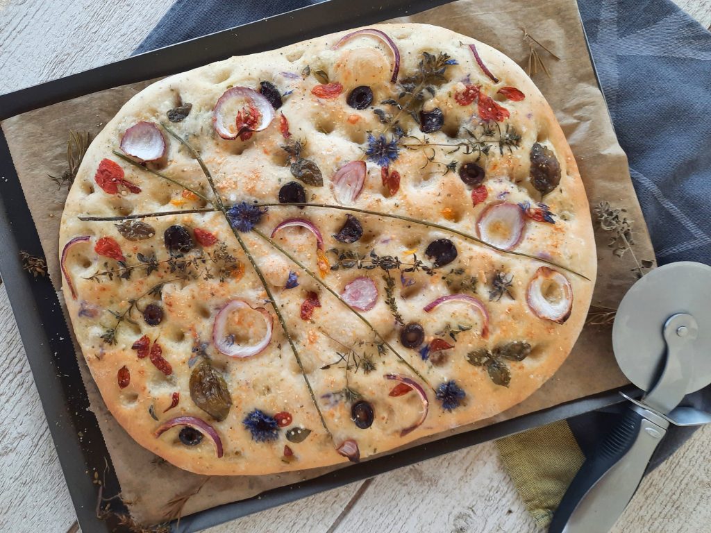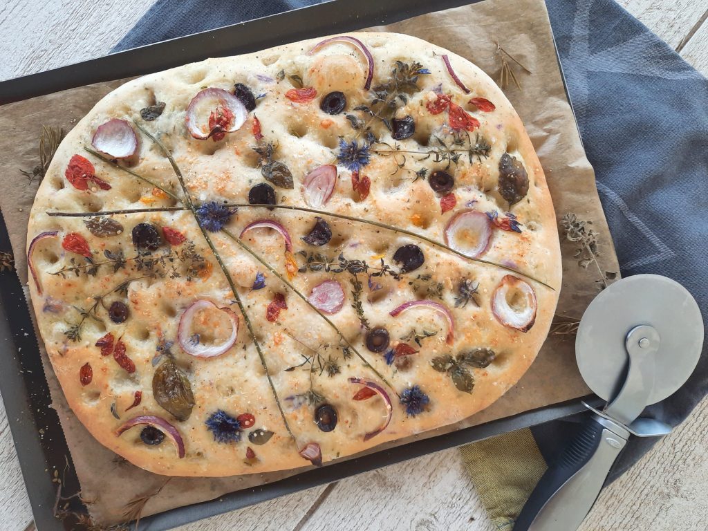 Dix minutes avant la fin de la levée, préchauffer le four à 200°C et parsemer la focaccia de fleurs de bourrache, d’olives, de thym, ciboulette, rondelles d’oignon violet, bleuets, sarriette, basilic… Vous pouvez parsemer au hasard ou former un joli tableau champêtre.