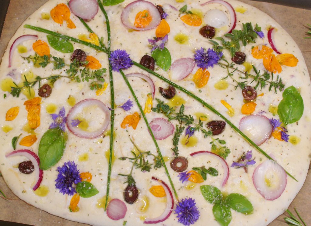 Pour cette recette, Séverine vous propose d’aller faire un petit tour dans votre jardin de fleurs comestibles pendant que la focaccia pousse gentiment, et à votre retour, vous pourrez vous amuser à la transformer en un véritable tableau coloré et gourmand !