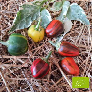 Petite mention spéciale pour la variété bio Madame Paraplü, ce mini-poivron est un feu d’artifice dans votre jardin mais également dans vos assiettes. Cette variété est la plus originale des trois variétés concernant l’esthétisme de ses feuilles et de ses fruits.