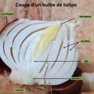 Le bulbe de la tulipe stocke toutes les réserves, éléments nutritifs afin de lui permettre de fleurir au printemps.