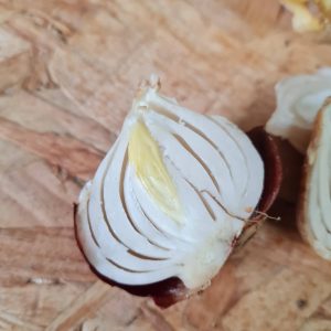 Bulbes de différents calibres | Bulbe coupé dans sa longueur. | Bulbe avec bourgeon floral. |